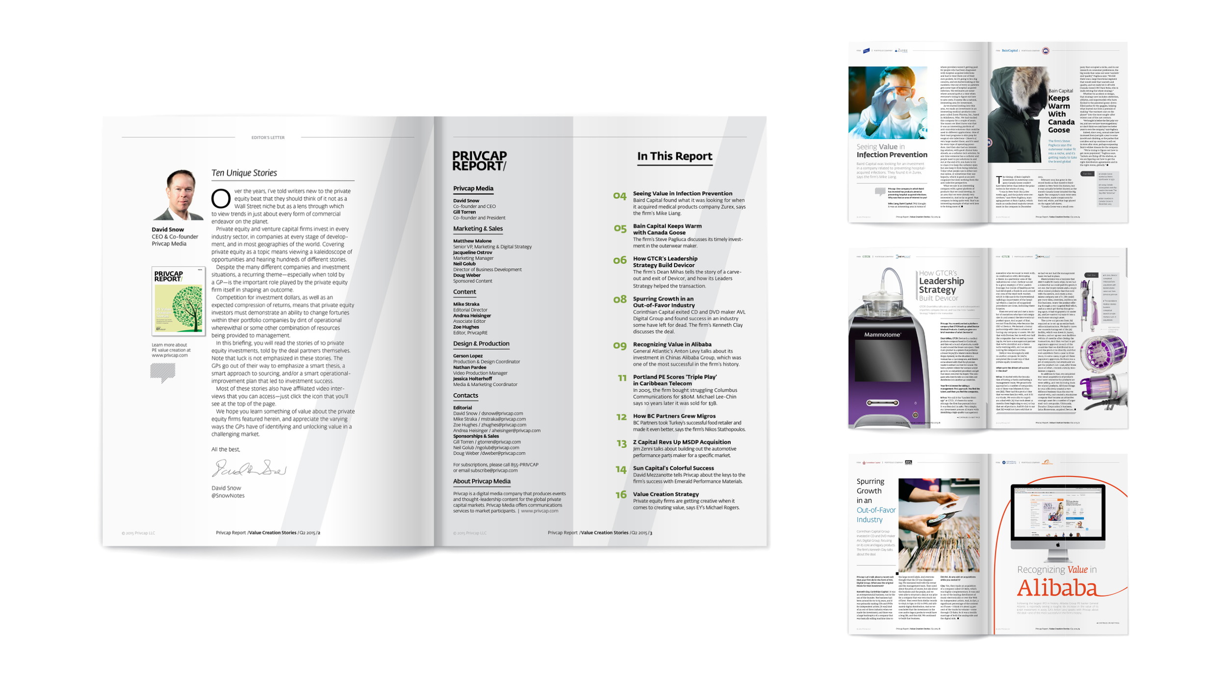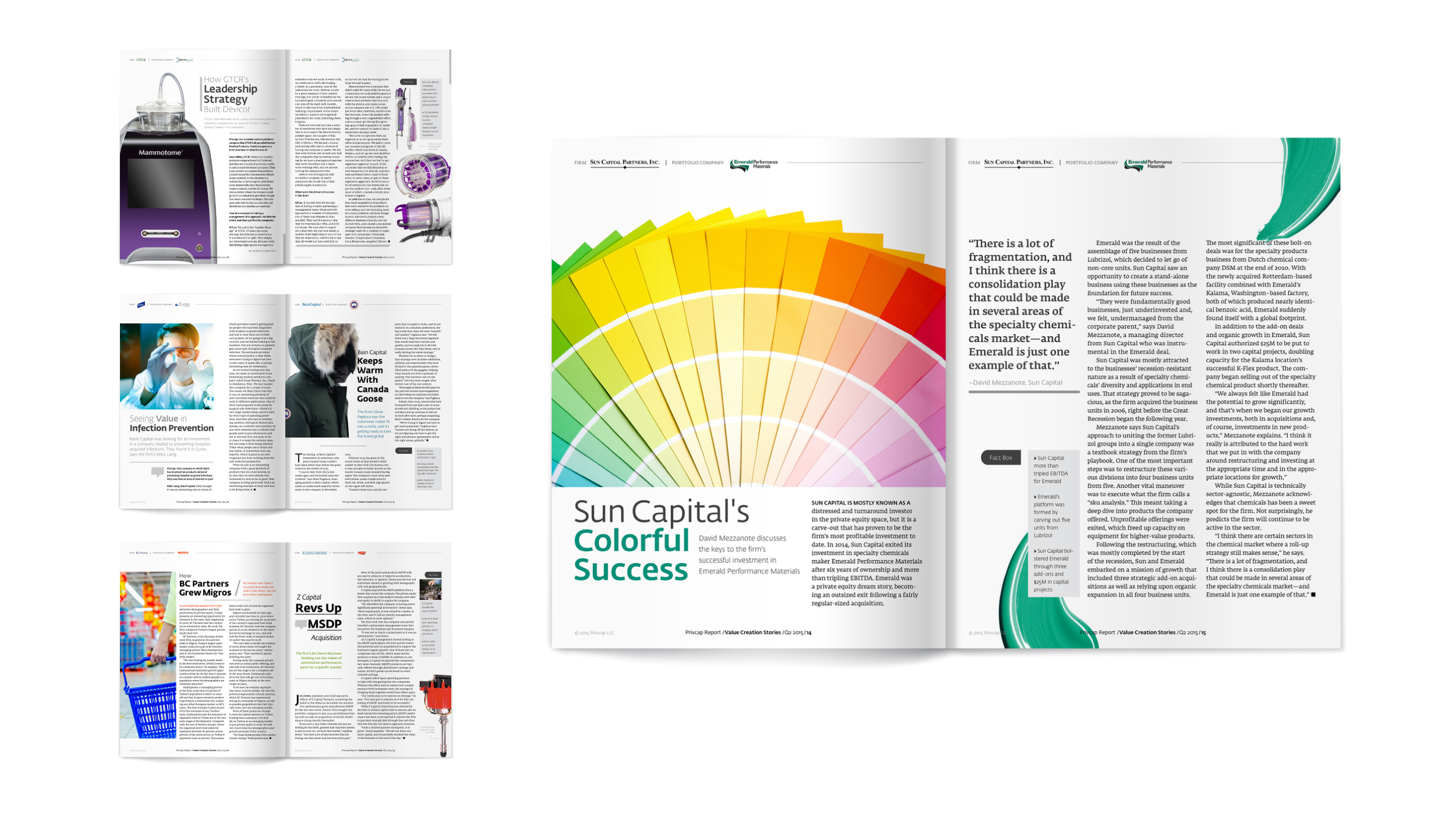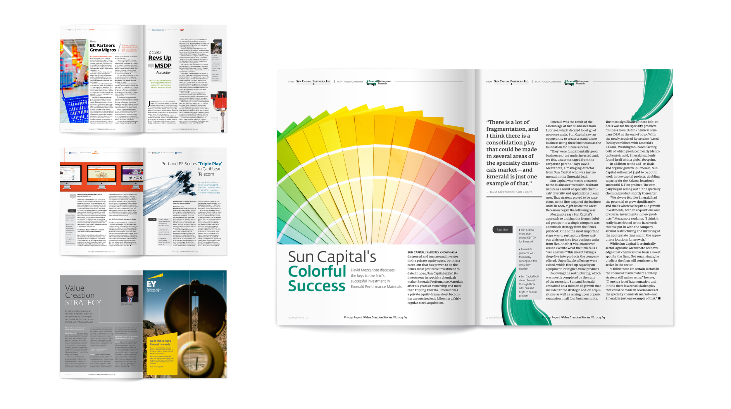 Through close collaboration with the editorial team and careful production oversight, these publications translated complex industry insights into clear, well-designed materials that supported both Privcap’s brand and its clients’ communications. The previous examples highlight two of these projects, demonstrating the balance between editorial storytelling, structured design systems, and efficient production coordination.