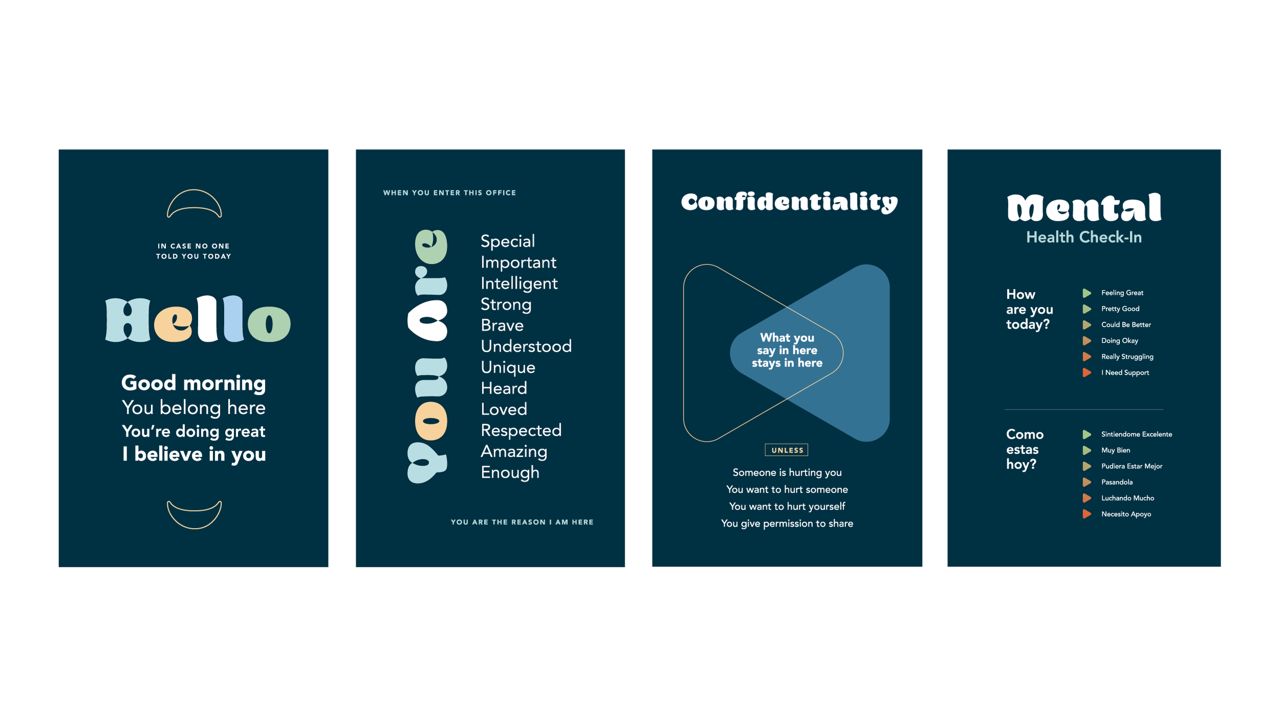 The challenge became finding a way to create a cohesive visual system that could unify the environment while communicating thoughtful mental health messaging.