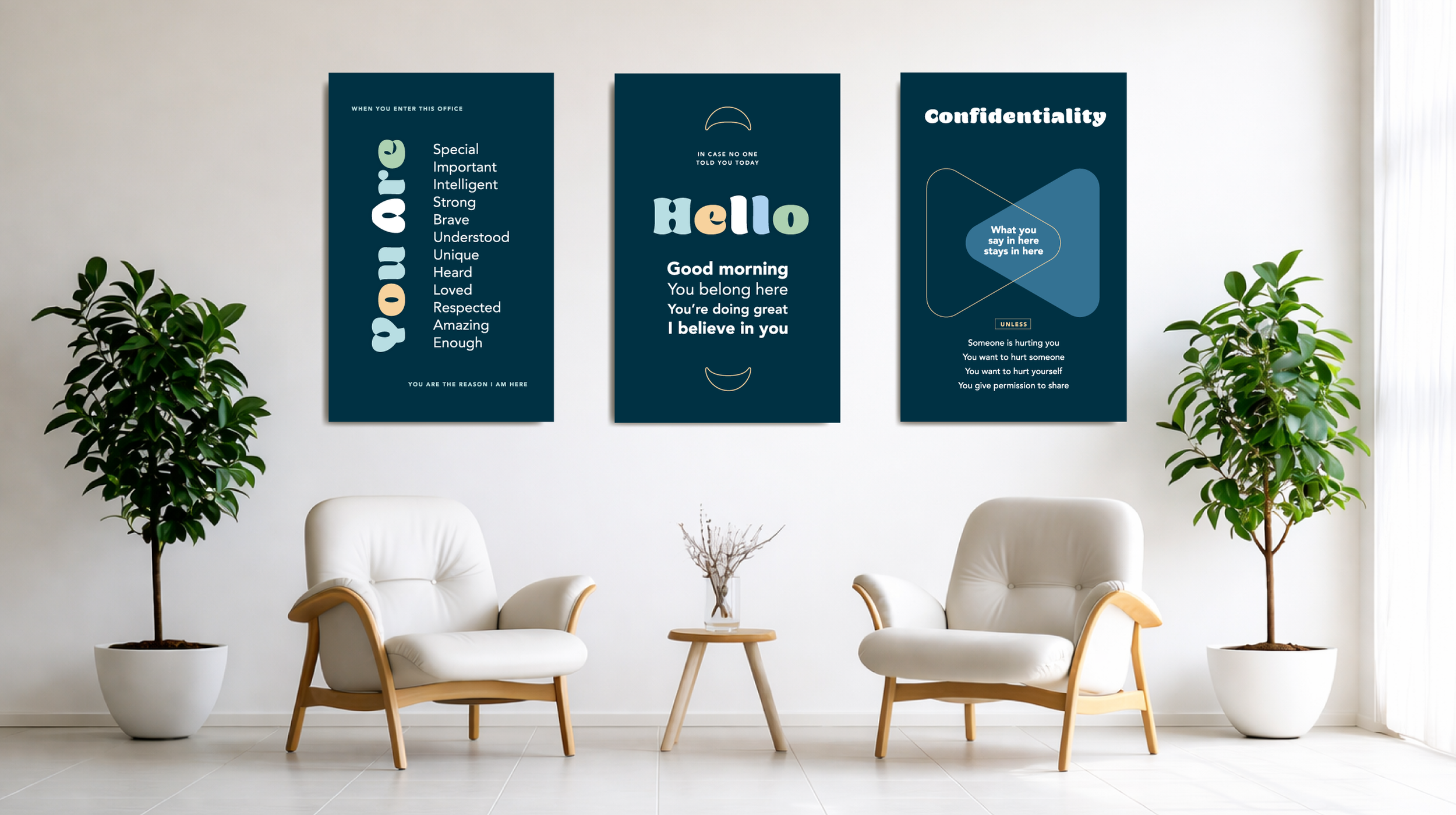 Together, they created a cohesive visual environment that reinforced the values of the therapy practice while enhancing the overall atmosphere of the space. Rather than feeling like standalone graphics, the posters became part of the architecture of the room — guiding the tone of the experience from the moment clients entered the office.