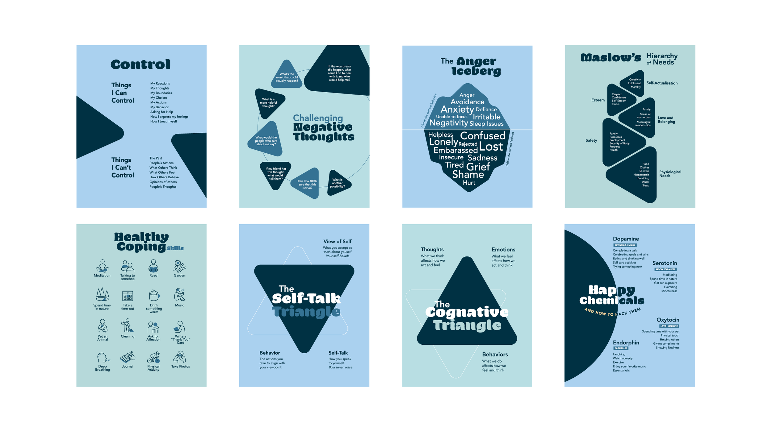 After reviewing reference materials and therapeutic content provided by the client, I curated a selection of mental health principles that would resonate with visitors entering the space. The goal was to communicate supportive ideas in a way that felt approachable and visually calming rather than clinical.